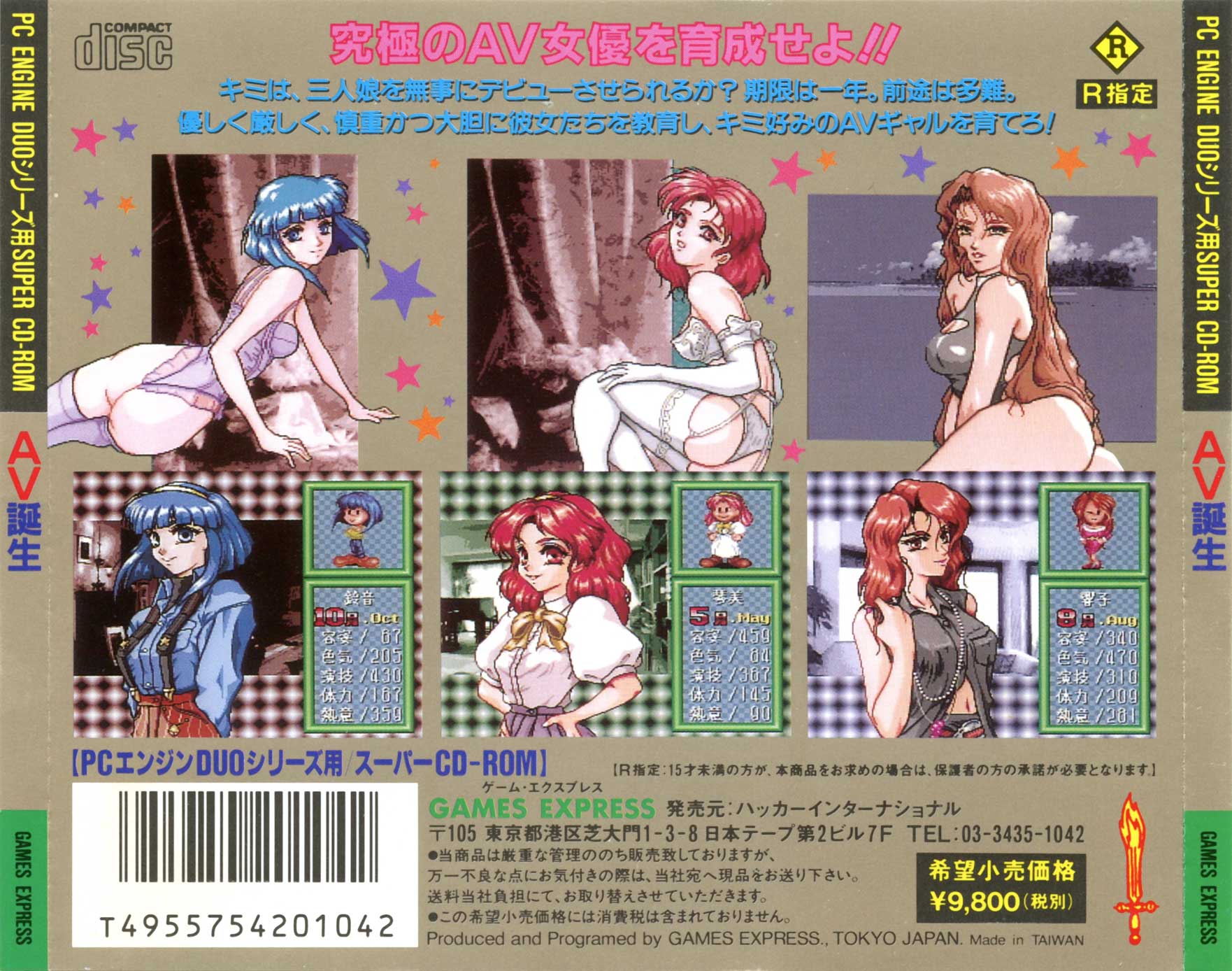 AV Tanjō is a typically Japanese 'life-sim' in the same vein as Graduation, but with more explicit adult content due to it being an unlicensed Games Express release. You get to 'manage' the lives of three pretty young girls, Kotomi, Kyoko and Suzunu. You plan their month ahead by selecting various activities like aerobics, dating, showering, relaxing etc but must be mindful of the statistics on the right hand side of the screen. Certain activities can lower some stats while raising others, so choose with care. After each month, you get a girl chosen at random and can give them something extra (like a present) to keep them happy.
