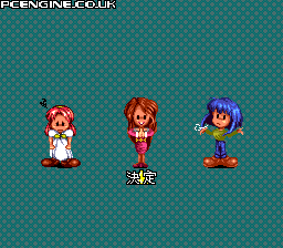 To view all the girlie pictures, push RUN, UP, RIGHT, DOWN, LEFT, SELECT, II and I on the title screen. Then choose the girl you want with I and use left/right to alter the option. |