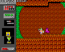 Despite being Hudson’s Vol.2, this was in fact released almost a month before The Kung Fu. It’s a conversion of what most people know as Wonder Boy in Monster Land, and it’s as perfect a conversion as you’re likely to get. This game takes a different pace from the first Wonder Boy game, being more of an adventure with a slower pace and more strategy. You start the game with barely a thread on and are given a sword by some wise looking dude who lives in a tree - so far so good. It is then your task to travel through the various platform-based levels defeating monsters and evil bosses along the way. Each enemy you kill leaves behind a coin or money bag (these are also at various hidden locations if you jump at the right spot) and shops will offer you armour, shields, weaponry and go-faster shoes. You can also pop into a bar and top up your energy if you can afford it. Levels are time limited (shown by an egg-timer on the left) so you need to be quick, or energy is taken away from your heart meter.