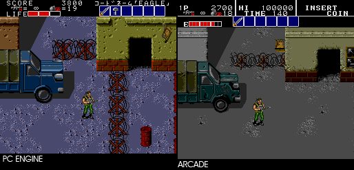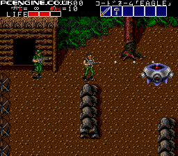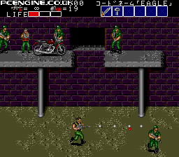 I like the fact that they don't phone this in, there's a lot of variety in the game that you wouldn't have found at the time. There are helicopters to fight, you get to steal motorbikes, and there are some good set pieces. You even rescue hostages, a-la Rambo (in fact the game is pretty much a pastiche of 80's action films and a bit of Metal Gear). This is the kind of game that's just fun to play, and you can come back to it for some mindless badassery time and again. That said, the continues on the TG-16 version are infinite, which is a bit of a mixed blessing. You'll complete it just by sheer number of attempts, but you won't have the same accomplishment unless you ration out the continues yourself. That's not to say it's easy though, there are definite hard parts that will frustrate you. soop