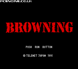 Browning is a side scrolling action game that puts the player in a power suit and pits them against hordes of miscellaneous mecha with some very big guns. You walk and shoot, run and shoot and also fly and shoot, although flight time is limited due to the useless engineers failing to fit a large enough fan in your jetpack. After ploughing through a few screens of nasties, you are presented with a particularly unfriendly boss mecha who seems intent on aggressive negotiations. After quickly dispatching said boss, you are free to move on to the next level and do it all over again!