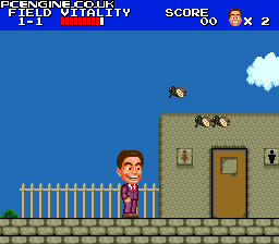 Overview Based on a popular comedy duo, Hudson has taken the gameplay from the original Wonderboy and transplanted it with a dash of toilet humour. Many key elements from Wonderboy are here...your ever decreasing health bar (topped up by fruit), the method to jump higher by holding down the attack button, but there are a few differences. Attacks are made in several ways; first by a simple kick (short range and difficult to judge), second by a powerful bottom burp (but remember to turn around before letting one rip) and if those are too much, just jump on the enemies heads in a Mario style. Throughout the landscapes are many objects to be kicked, some gain you coins, some fruit, others open up bonus areas (like the Wonderboy-style bonus level in the clouds). Also, kicking a doorway will open it, allowing you to venture inside to either full health and tips from your partner (usually in some crazy disguise) or a fruit machine where you can gamble collected coins to gain goodies. And speaking of your partner, look out for him along the way, often making a nuisance of himself by throwing cans at you or taking a dump behind bushes.