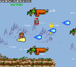 Based on the legend of the Monkey King, this takes the shoot 'em up genre and puts it into a fantastical ancient Chinese setting. Riding on your cloud, you have to fend off oriental spirits and monsters that seem to have taken a dislike for you. Take care though, as one hit and you are dead - sending you back to the last restart point in the level. Helping you on your travels are, of course, the obligatory power-up pods and also an occasional shop where you can purchase such useful powers as a ring of fire and 3-way reverse shots. Also handy is the fact that you can spin around at any time to shoot whatever is creeping up from behind. At varying stages throughout each level you face a boss which must be dispatched to move on.