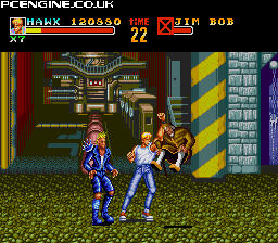 This scrolling beat em up certainly shows the PC Engine is technically capable of moving big sprites around with no clash or slowdown. Unfortunately the graphics are rough and look almost half-finished, although this is partly down to the 'style' it just looks ugly in places and the lack of colours used on the background doesn't help matters. The sprites are reminiscent of Final Fight, but are poorly proportioned and badly animated for the most part. Visually, it's a disappointment coming from a developer like Hudson. Music is neither great nor poor - there are a few nice tracks and sound effects are sampled, which is essential to get that feel of proper impact. The game itself is simplistic and repetitive with a lack of moves to add variety and the levels are a little too long, although the frequent change of scenery is welcome. It isn't all bad - the game is fun for a while and if you are in the mood for something long and brainless then it serves its purpose well. But you can't help thinking that with a little more time and love put into it, it could have been a stand-out game for the machine. sunteam_paul