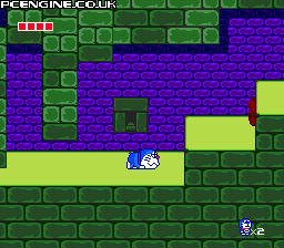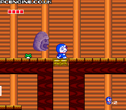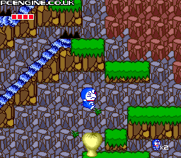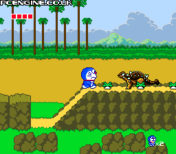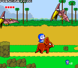 Taking a different route to its maze-based predecessor, this Doraemon game is a side scrolling platformer with a simple, colourful look. You have to rescue your friends who have dived into various books and are pursued by the inhabitants within. You start off having to avoid the wandering beasties, but eventually get hold of such items as a gun that freezes anything in your path for a moment. Along the way you get to ride on dinosaurs, crawl under moving stone blocks, creep along precarious ledges and slide down water chutes.