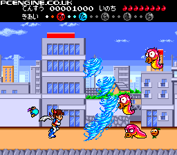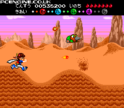 While screenshots may make this look like a straightforward platformer, it’s actually a little different. It is (for most levels) an auto scroll platform shooting game, where you are constantly running, dodging and building up different ‘powers’ accessed by holding down the fire button. These range from whirlwinds to multiple genies and can get quite destructive when fully powered.