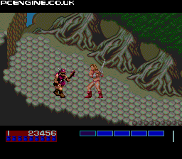 What the hell have they done with this? Golden Axe was one of my most frequently played arcade games in its time and the Mega Drive version was a joy. This, however, is a travesty. The PC Engine is more than capable of a great conversion, but in steps Reno/Telenet and makes a complete dog's breakfast of the whole thing. Firstly, the visuals are awful. Basic backdrops and poorly drawn and coloured sprites resemble the arcade, but not nearly enough. Animation is sloppy, and character movement is ugly and cumbersome. The magic effects are also half of what they should have been. And fans of the original will be shocked by the corners they have cut with the gameplay also - gone are the position specific attacks. No more throwing your enemies or bashing them over the head with your sword hilt - these are the things that made Golden Axe fun! The music is also for the most part very badly arranged, with the cheapest synth sounds being used that do nothing to evoke the spirit of the original. But the icing on the cake is the sound effects, which prove once and for all the programmers have no clue what to do with the hardware - the sword slashing sounds like a duck quacking, and some of the magic spell sounds will make your ears bleed. Some may think that the extensive animated sequences that introduce each character are a big plus point to the game, but to me they only show where all the budget went, which was certainly not on the game itself. It's no wonder that NEC Avenue took over most of the Sega conversions after this sloppy piece of work. If you're not familiar with Golden Axe then you may get some small enjoyment from this game, but for me, just knowing what it could have been like frustrates me all the more every time I force myself to play it.