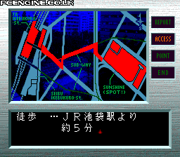 The stories are presented in similar ways, with limited interaction. Most are text over digitised images (with some animation here and there) and sinister music and sound effects. Others allow you to chose map or building locations and hear a relevant story or report. There are also a selection of tales read by Junji Inagawa - a Japanese actor and horror author.
