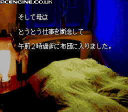 Hyaku Monogatari is based on a traditional Japanese parlour game in which a group of people would tell 100 spooky tales in one night, extinguishing a candle after each one. Once the final tale was told, it was rumoured that the spirits would appear and something pretty nasty might happen, which is why most players called it quits at 99. The PC Engine take on this is not a game, but a collection of stories. You are presented with a screen showing 100 candles and you can choose (in any order) whichever one you like. You are then shown a scary story which ends with the candle being blown out.