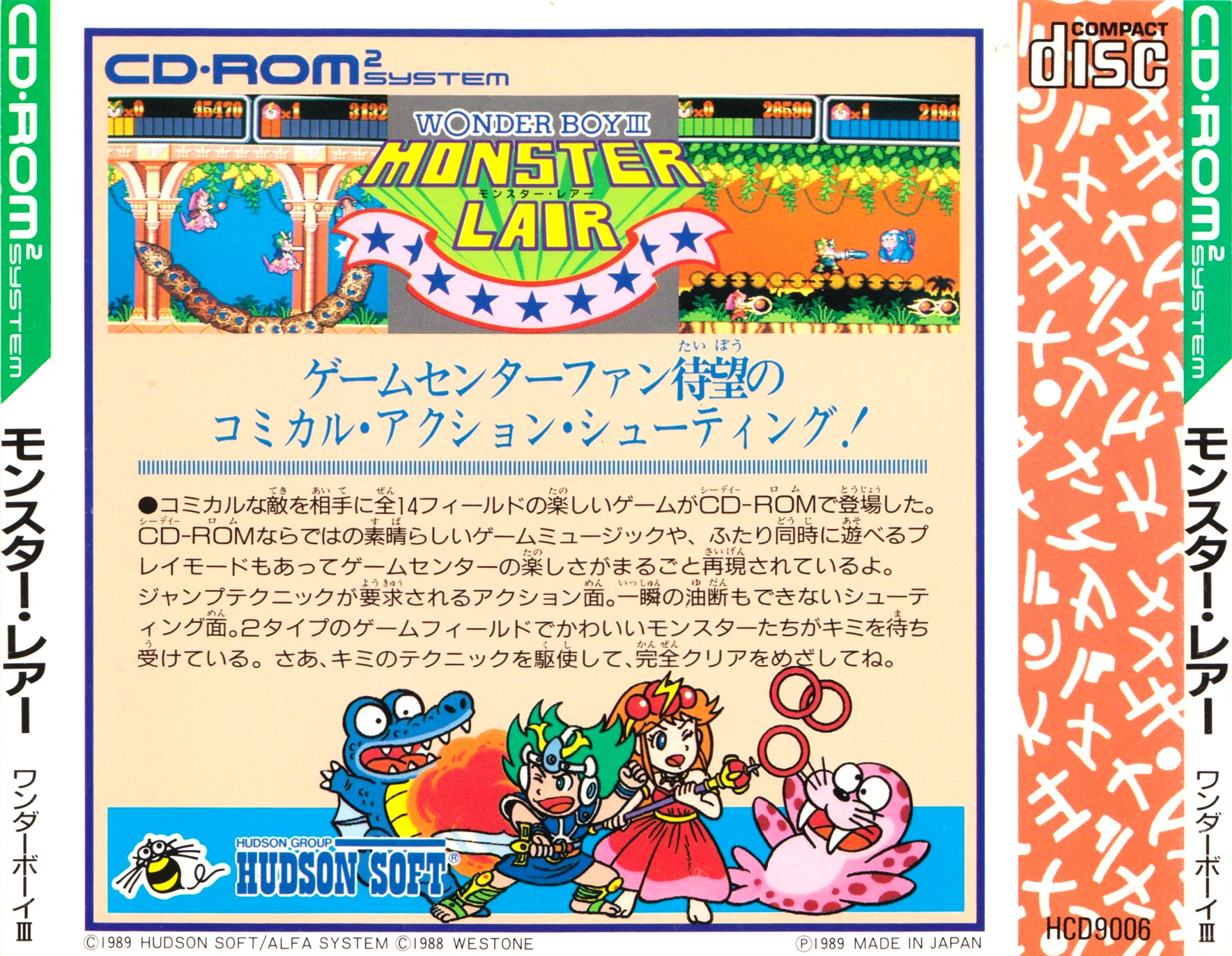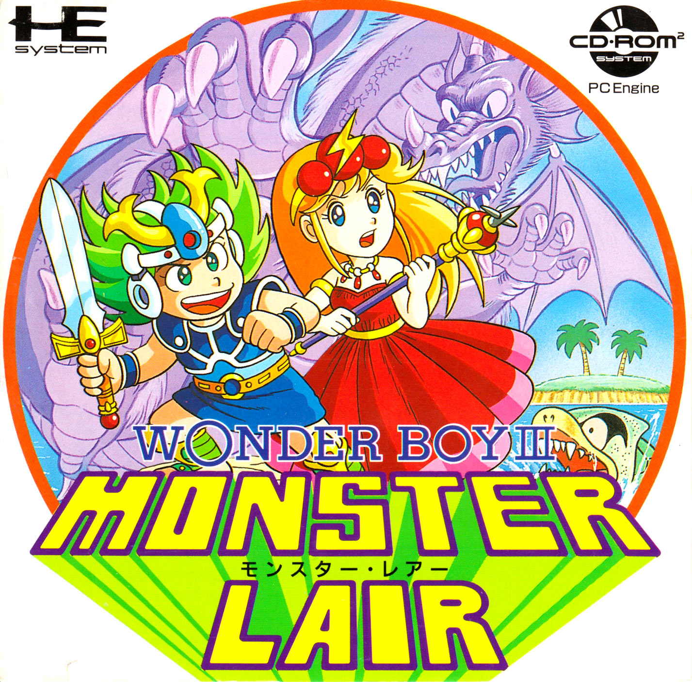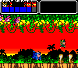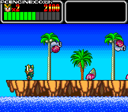 Feeling more like the first Wonder Boy than the second, Monster Lair is a fast-paced auto scrolling platform game. The levels are split into two stages, the first being a platform stage, the second a shoot 'em up stage which ends in a boss. During the game your energy counts down, so you must keep picking up fruit to replenish yourself. There are a variety of weapons to collect - lasers, spread shots, spinning shields and so on, but these are also on a timer and do not last long, so weapon switching is frequent to avoid being left with your basic short range sword shot. The game is single or two player simultaneous.