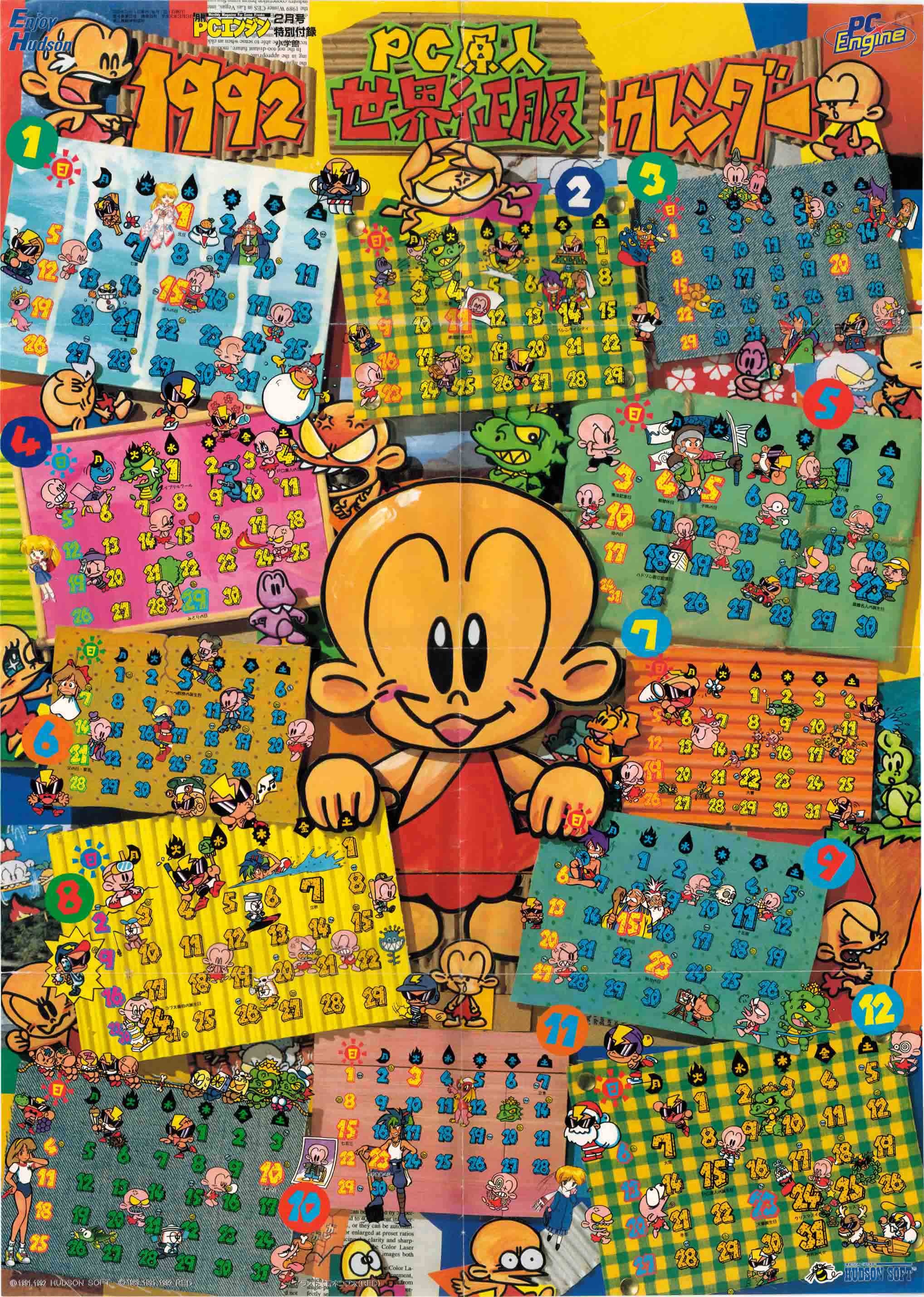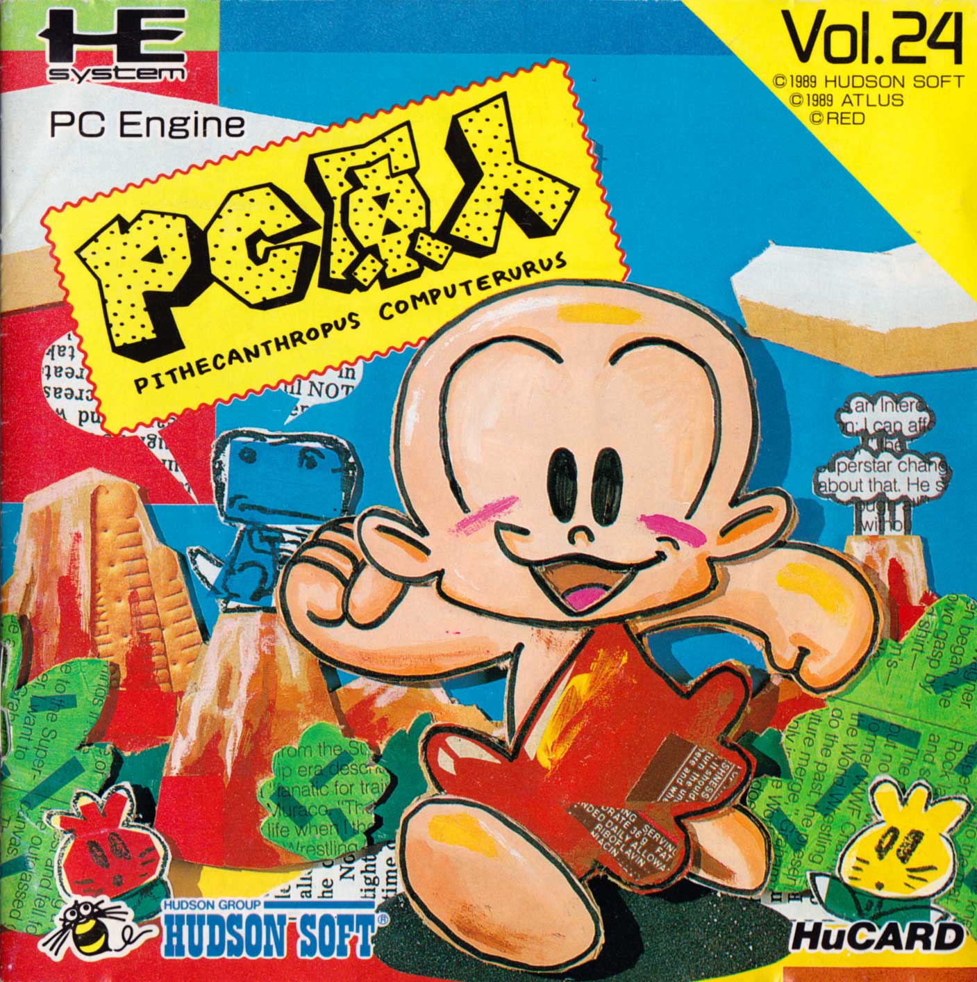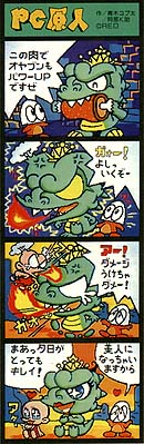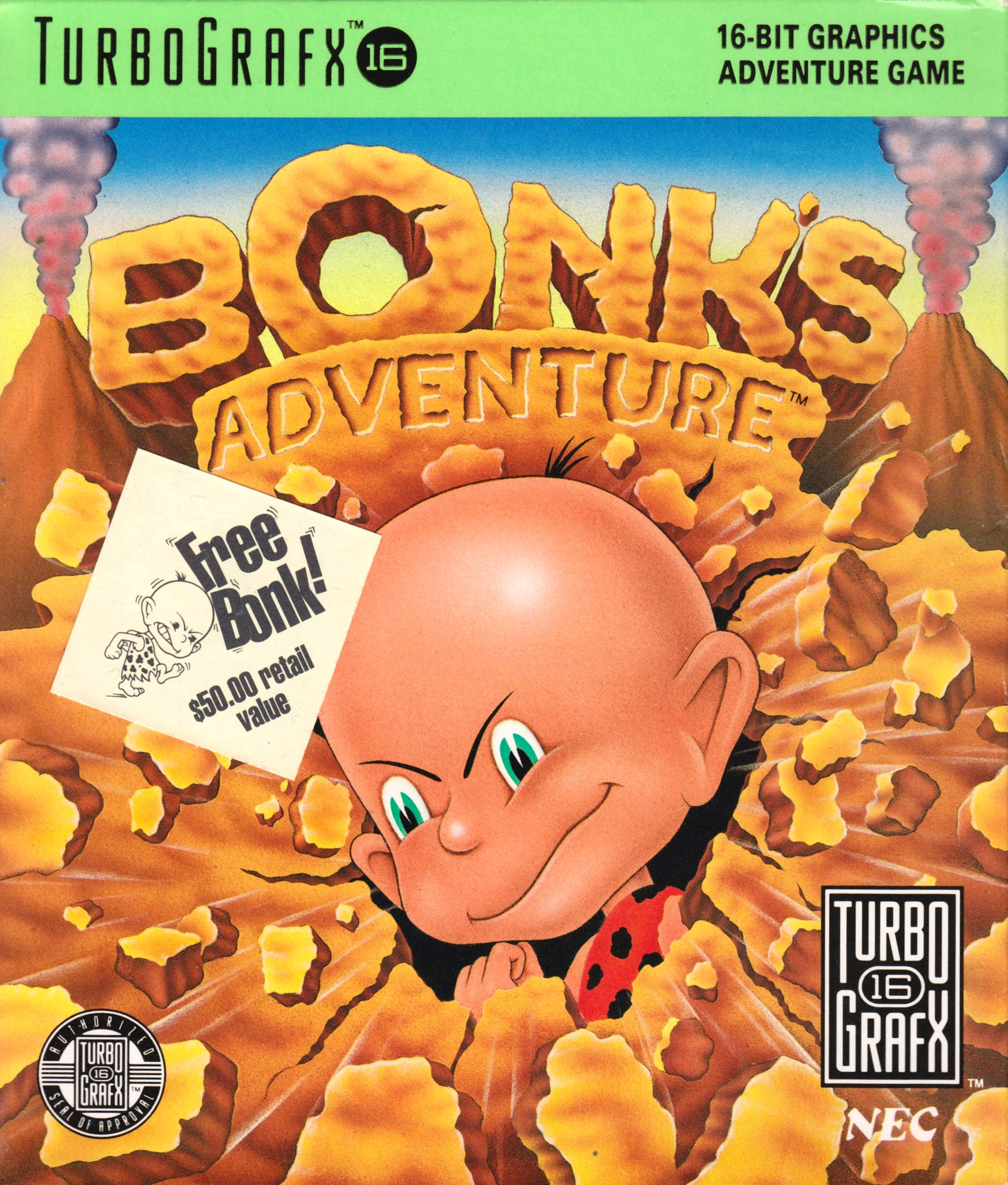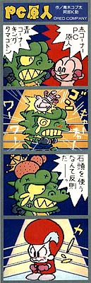 NOTE ABOUT THE NAME: In Japan, Bonk/PC Kid is called PC Genjin. Genjin means pithecanthrope or primitive man which ties in nicely with the PC (Pithecanthropus Computerurus). This also leads to name-play in future projects like CD Denjin/PC Denjin (Air Zonk) where Den means lightning or electricity and Jin means a person. Genjin is also played with in CD Denjin’s title song, which refers to the main character ‘Genhead’ with the Gen coming from Genjin (and possibly a play on ‘Gunhed’). However, the name ‘PC Kid’ is the original intended English language name (before US marketing bods came up with ‘Bonk’), as it has appeared (in English) in the Japanese literature. Got all that?