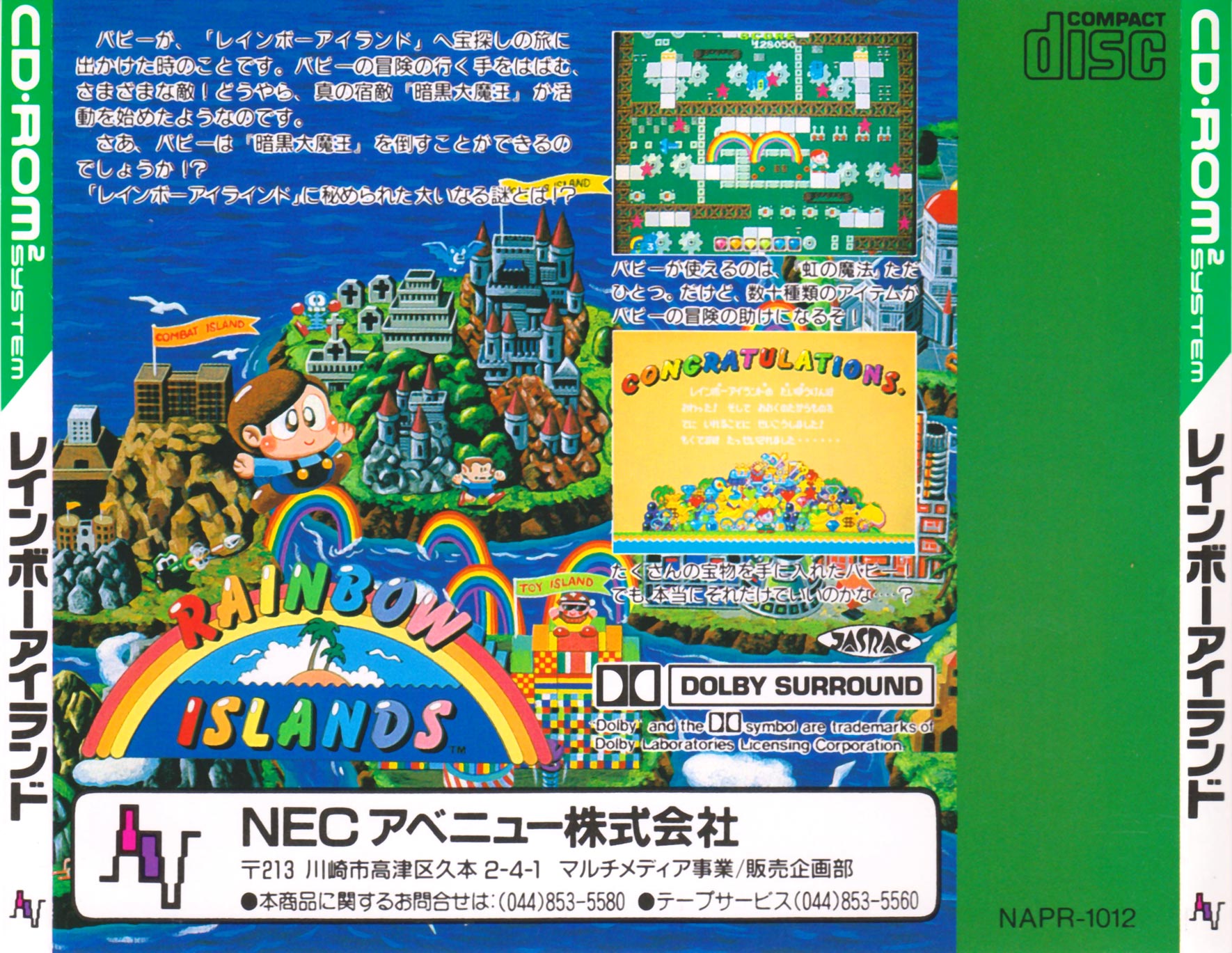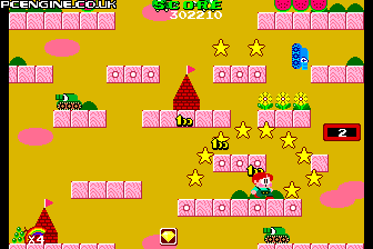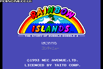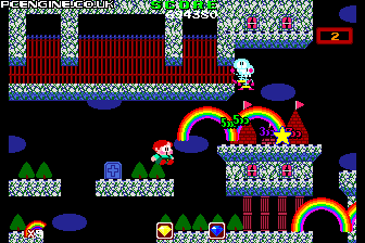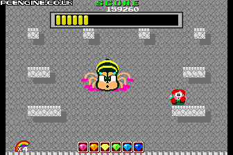 And that would be it, but this is the sequel to Bubble Bobble, and therefore, this game is absolutely rammed with secrets. You see, there are multiple endings to the game. If you crush a rainbow over an enemy, a gem will be thrown out on the screen, in a different colour depending on where it lands (I think). If you collect 7 different coloured gems on the same island, a giant gem will appear, and collecting all seven of these will cause three more islands to ride from the sea, and enable you to obtain the true ending. The PC Engine is rare, in that it was the only release until I think PS2 that even had these extra three islands. Moreover, if you collected the coloured gems in the correct (rainbow) order on each island, a door will appear giving you access to a permanent, death-proof power up.