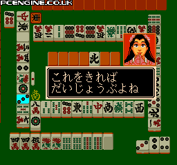 This is one of the earlier mahjong titles for the PC Engine, having come out at the end of the 1980s. As such, it is relatively simple compared to more story driven games that would come later on the platform. However, this game does exhibit quite a bit of personality and charm in the characters, their reactions, animations and dialogue. Each character has corresponding voice lines for the various mahjong moves like pon and chi, but they all share either the male or female voice. Each character is represented by a different pitch and tone as their text is printed to screen, giving them more differentiation and character.