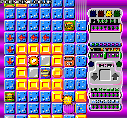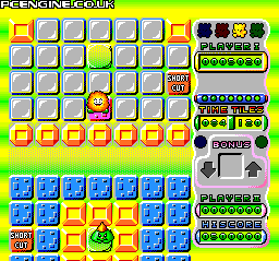 Colourful game like a 2D Q*Bert. Run around the level, painting the background blocks as you go and avoiding enemies. There are many traps, sliding blocks, one-way blocks and teleports - also special items such as time-stop and extra firepower to zap the baddies with.
