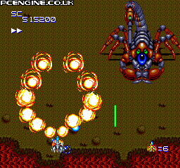 Considered as a kind of unofficial sequel to the hit game Gunhed, Super Star Soldier follows the same formula, with a selection of upgradeable weapons and a variety of space and land-based landscapes to fly over. Smart bombs are achieved by collecting flashing power-up orbs, and these also give you an extra bonus - the ability to continue from the point of death for each one you collect. Once you run out of these, you are set back to a restart point earlier in the level.