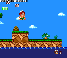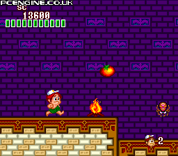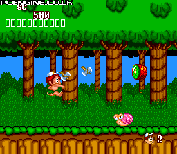 This is, in essence, an almost total clone of the original Wonder Boy game, albeit with a few extra bells and whistles. You must run through the levels, jumping pits, avoiding or killing wildlife and collecting fruit to top up your ever-decreasing health. Breaking eggs can yield benefits - from a fast moving skateboard to a fairy that grants invulnerability for a time. Each stage is split into 4 levels, and each of these has a restart point in the middle - and you will need it as one hit spells death.