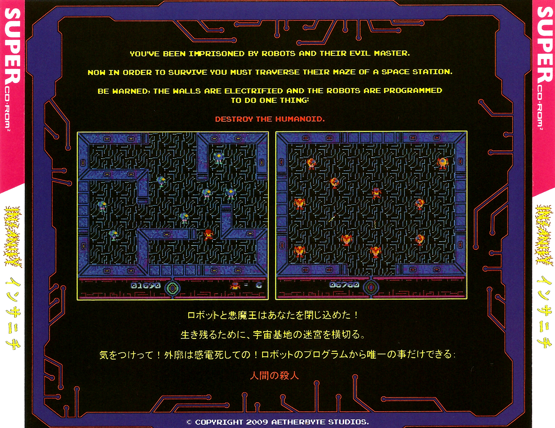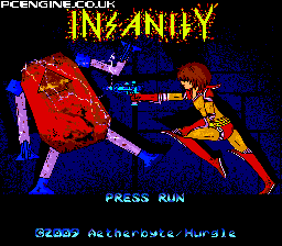 Imprisoned by an army of robots on a giant space station, you know there's only one thing you can do - blast your way out. That pretty much sums up the plot of Insanity, the first PC Engine game from homebrew developers Aetherbyte Studios. Insanity is essentially a clone of the classic arcade game Berzerk and retains the straightforward gameplay of the original. You run around the flip-screen play area (whose map layout is randomly generated from a selection of master templates) shooting the robots that are out to get you. The robots are pretty dumb to begin with and often blow themselves up by wandering into the electrified walls, but as you progress they get a little faster and a lot more aggressive, making anticipation and dodging of lasers key skills. The action is accompanied by a selection of retro styled music tracks, giving you the option of CD music or chip generated versions of the same tunes.