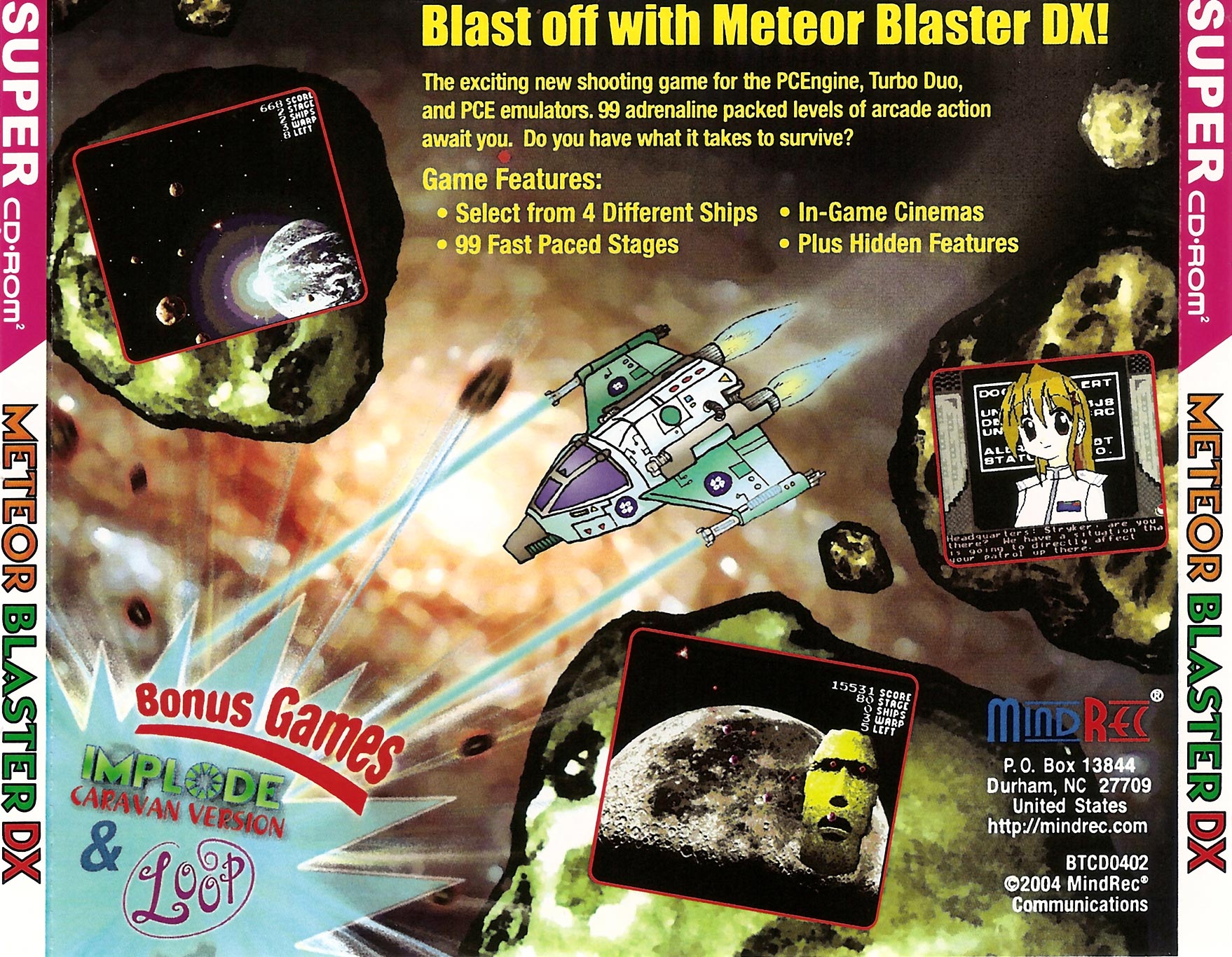 Asteroids style shooting game available as a free ROM, or as Meteor Blaster DX, an enhanced CD-Rom version from MindRec.