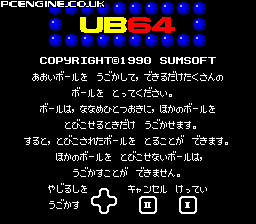 UB64 is a solitaire-style puzzle game. You move the coloured balls around the board, but can only do so by jumping them diagonally one over the other. If you can read Japanese you'll be lucky enough to know exactly why you are doing this. If not, then you'll probably end up like me and turn it off after about a minute. The ear-grating rendition of 'Michael Row the Boat Ashore' that repeats ad nauseam in the background seems to have been put there for no other purpose than mental torture.